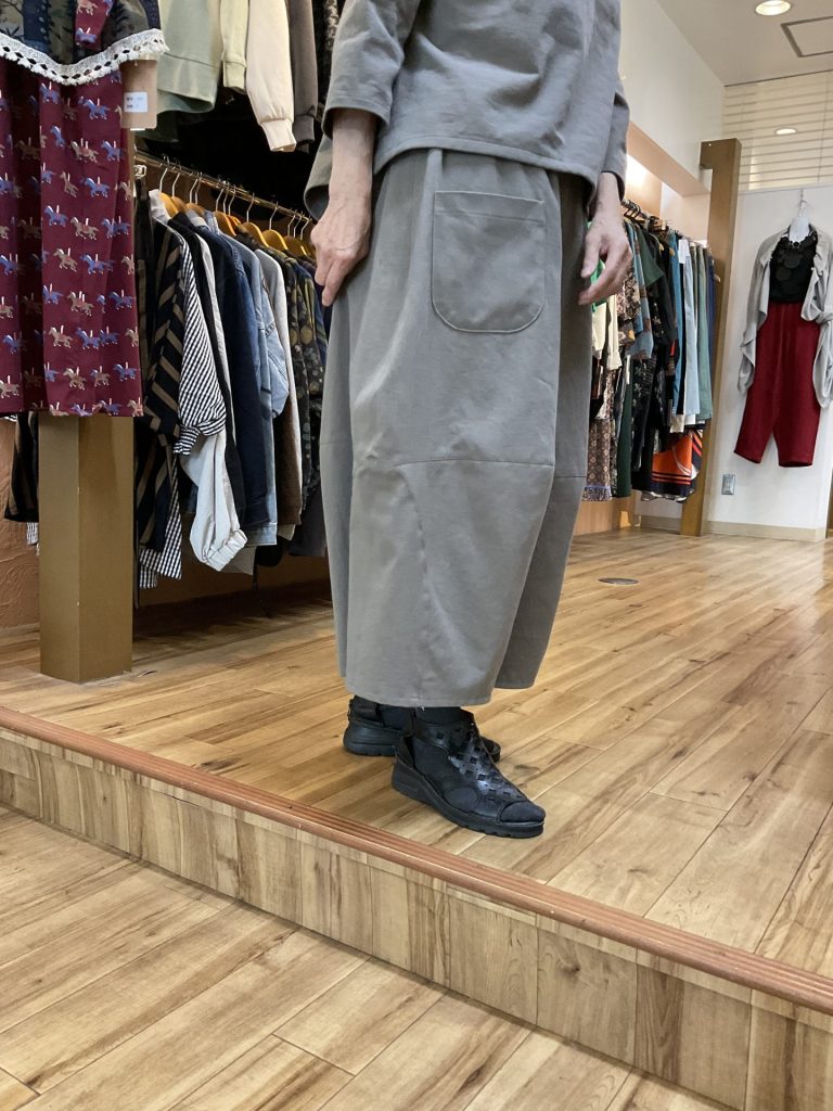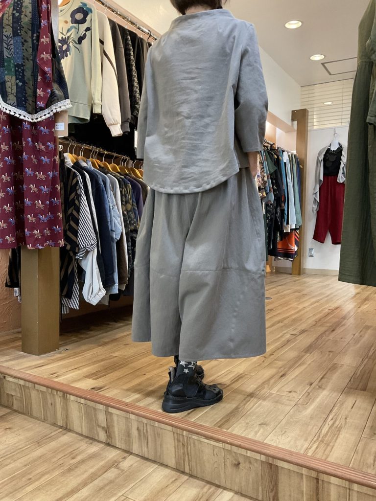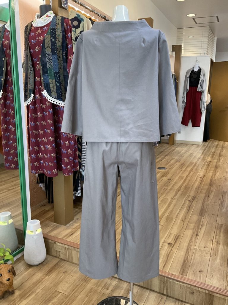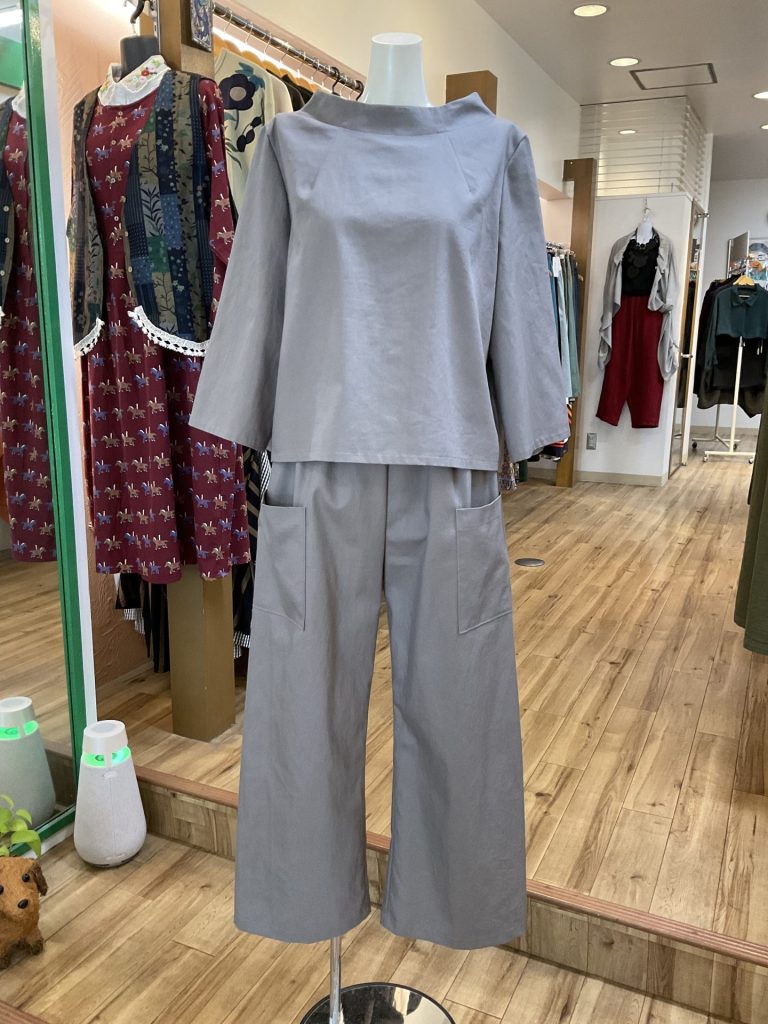 こちらも綿100%。上は同じくボトルネックのプルオーバーですが、裾の形が前が短くて後ろがやや長い作りになっています。下は切り替えバルーンパンツです。サイズはこちらは上がM、パンツはフリー。価格はそれぞれ税込み¥6,380と¥7,800としました。色は最初のほうはグレー、こちらはグレーにややベージュがかった「グレージュ」です。いずれも着心地の良さは奥方様が自画自賛しております。目新しさではなく、長く着ていただける作品ですね。気になられた方はどうぞお早目のお問い合わせを。