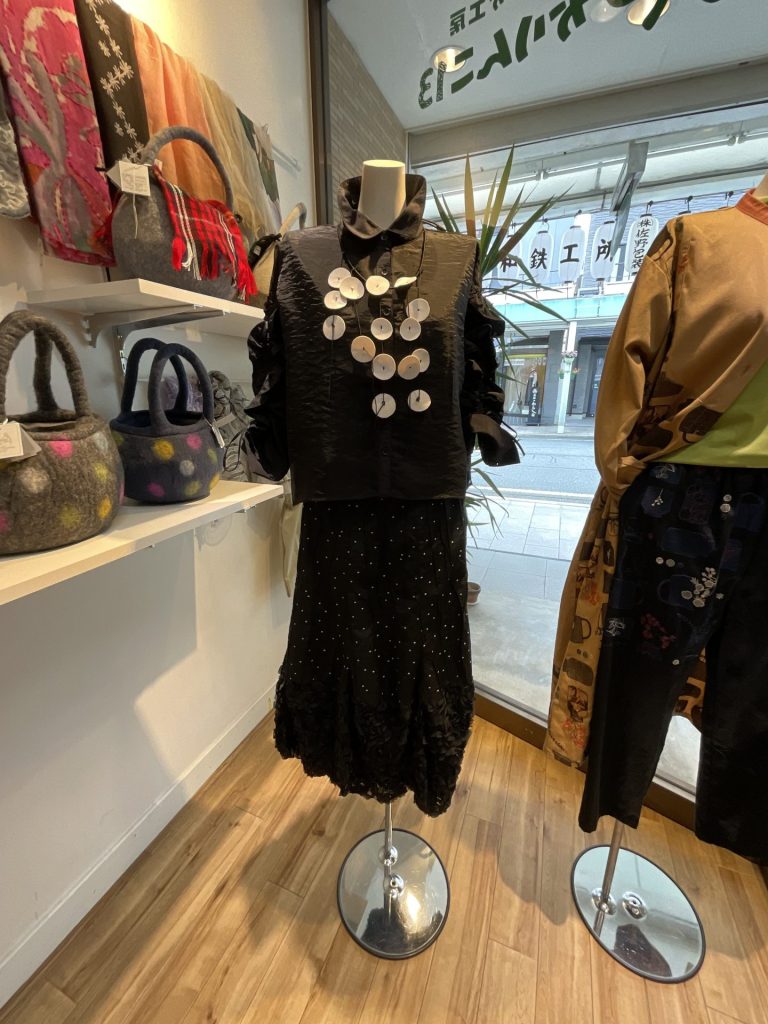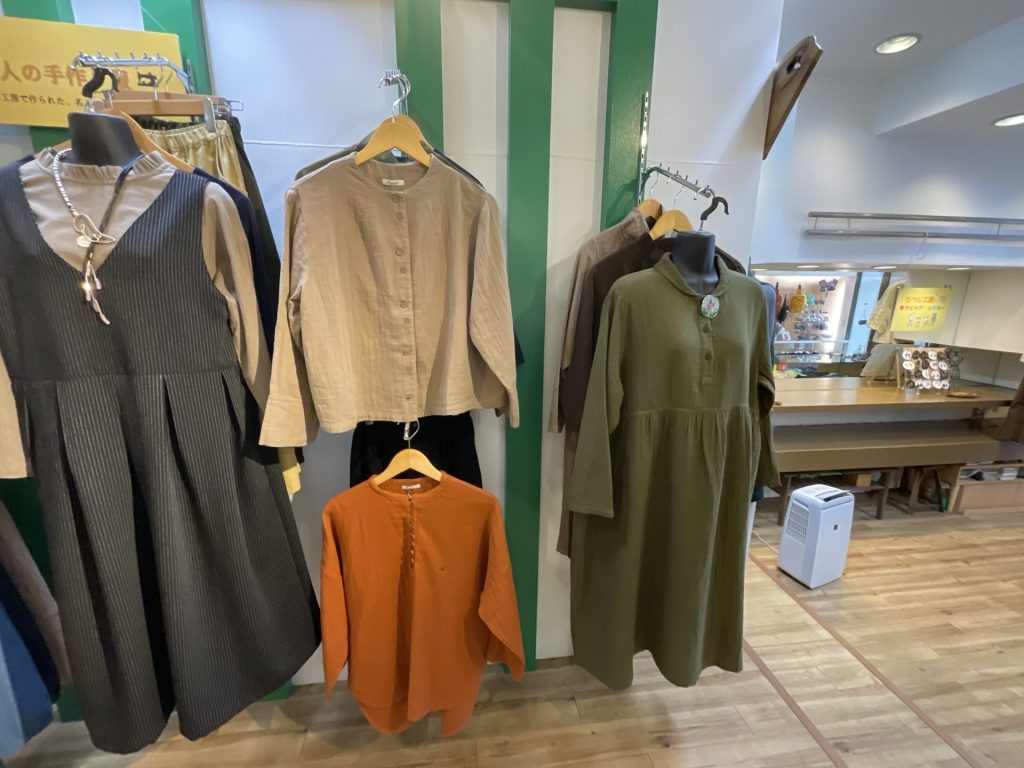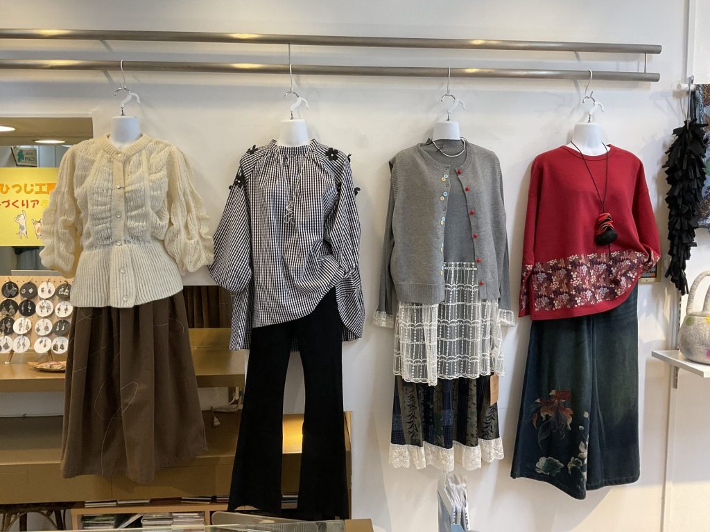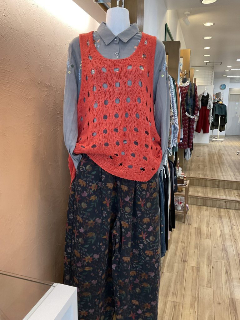 ようやく、「秋の行楽に着ていく服」と言って探しに見えられるお客様が増えてきました。かりんこさんイチ押しのガーゼ素材や、デニムをあしらったユニークな商品など、行楽に最適な商品も揃っています。ぜひ覗きにいらしてみてください。