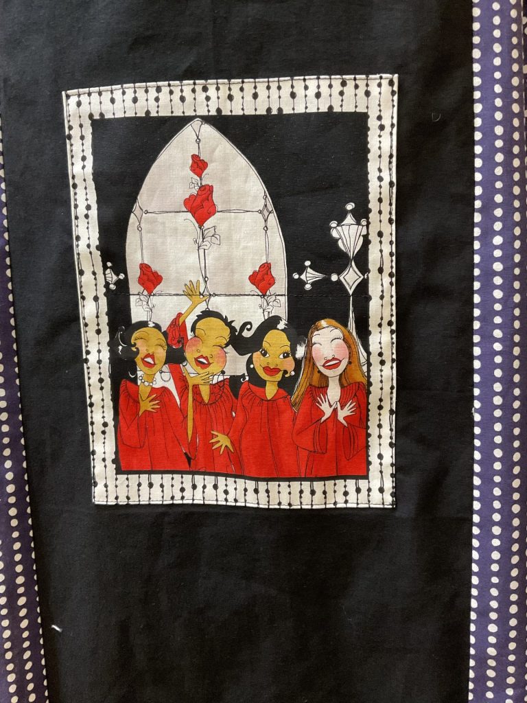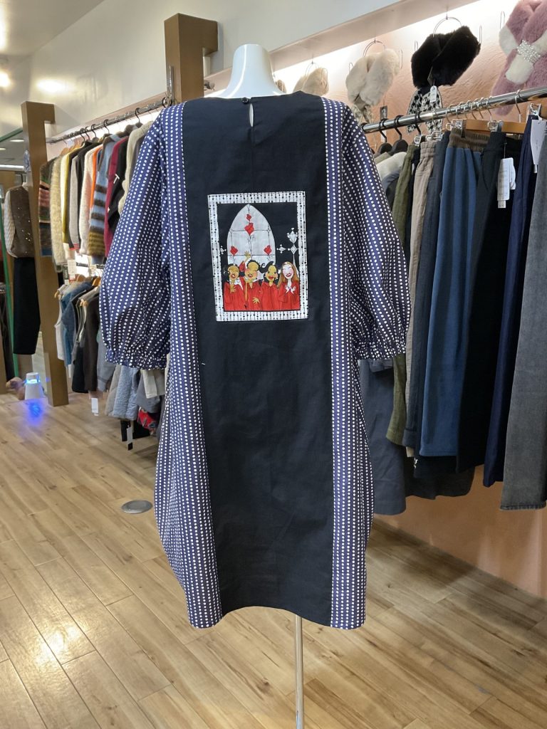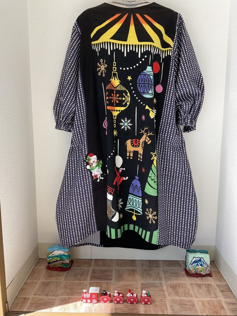 🎄Xmas用のバルーン袖エプロンドレスです。前面はおなじみ手ぬぐいで、背面は「Loralie Harris」のゴスペルクワイア柄の生地を貼り付けました。サイズはフリーで価格は税込み¥10,450となります。この遊び心を理解してくださる方、どうぞお問合せをお待ちしております。