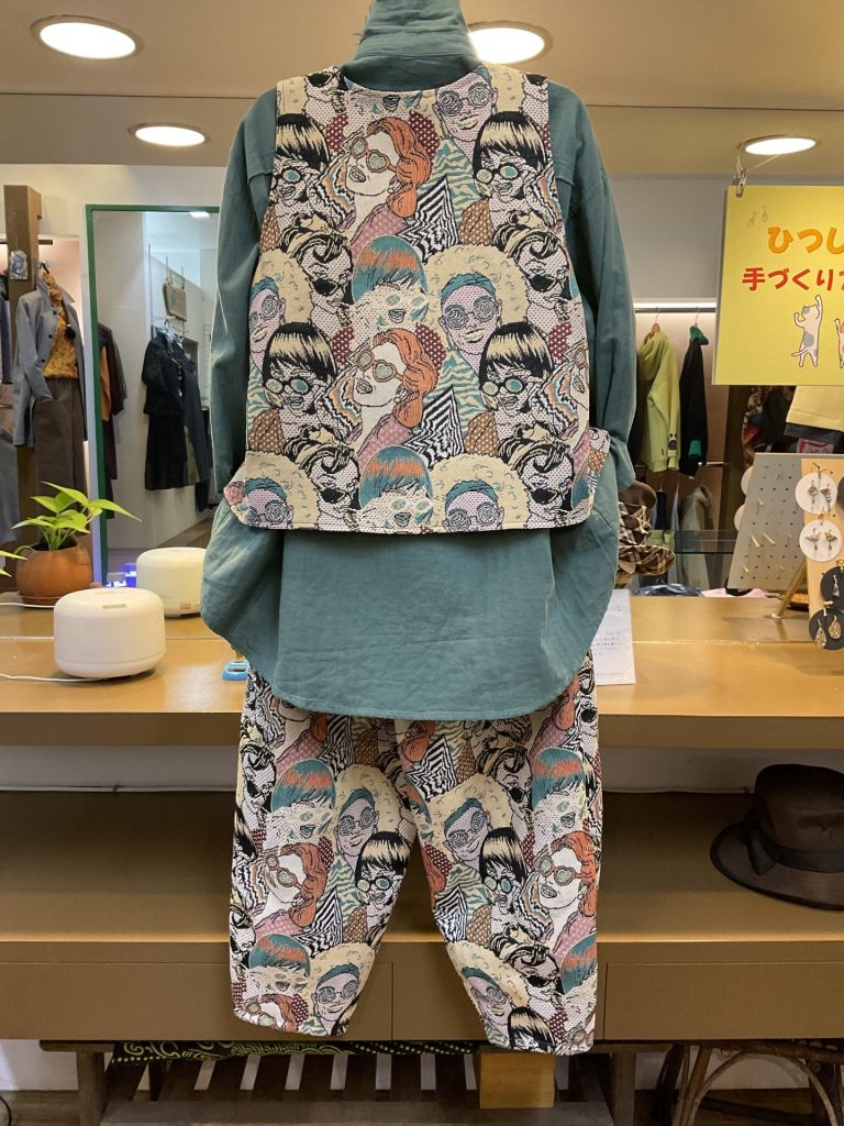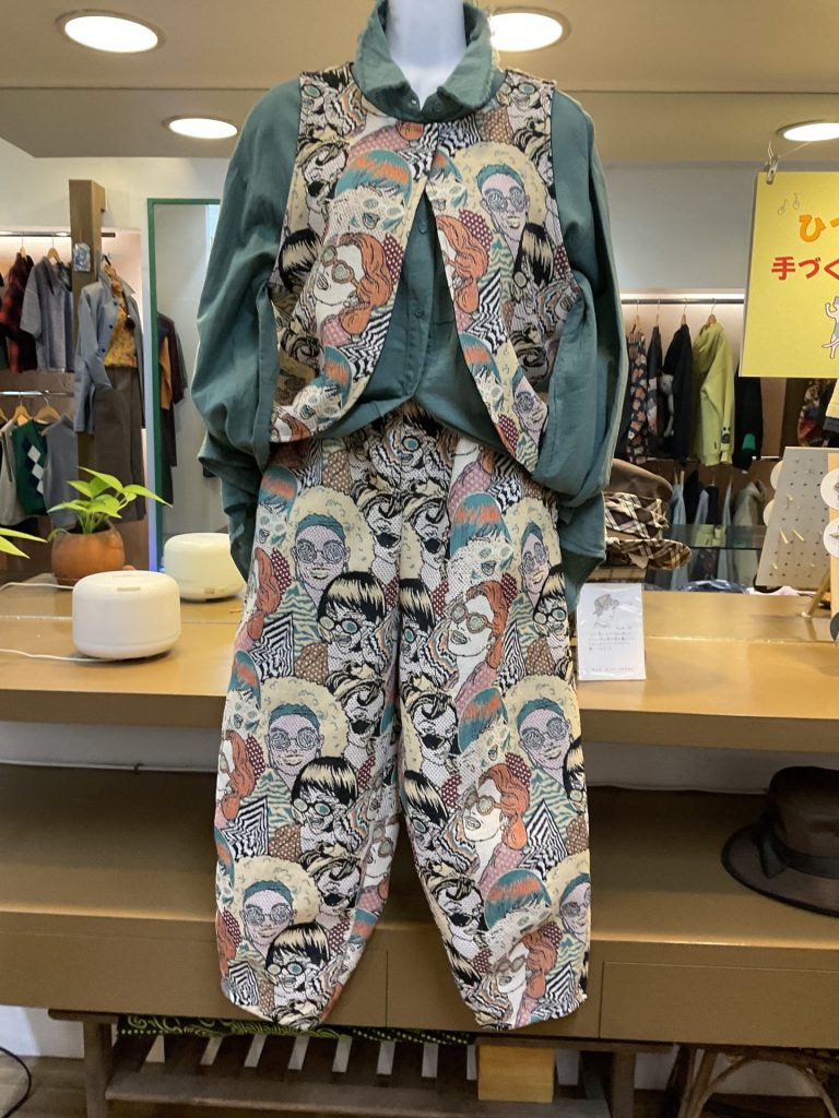 ユニークな絵柄のゴブラン織生地を使った2wayベストとコクーンパンツです。ゴブラン特有の立体感が絵柄の表情を更に豊かにしてくれています。サイズは上下ともM~L、価格はベストが¥4,800、パンツが¥8,800です。好みとしてはYesかNoのデザインになりますが(笑)少しでもYesの感情を感じた方はぜひとも見にいらしてください。