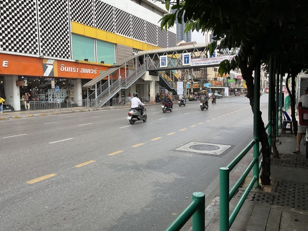 余談ですが、バンコクの交通事情というか道路事情。まず横断歩道が非常に少なく、歩行者用信号はもっと少ない。車やバイクやトゥクトゥクがビュンビュン走っているところを手で合図しながら渡るしかない。初日はビビりましたがなんとなく慣れてきましたけどね。
